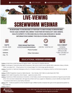 Local Live County Viewing – County Agents are encouraged to host a local live viewing of the same Zoom Meeting in your county for farmers, ranchers, veterinarians, elected officials, and other interested residents. Bring your community together around a timely and important topic. Invite your local veterinarians, too!